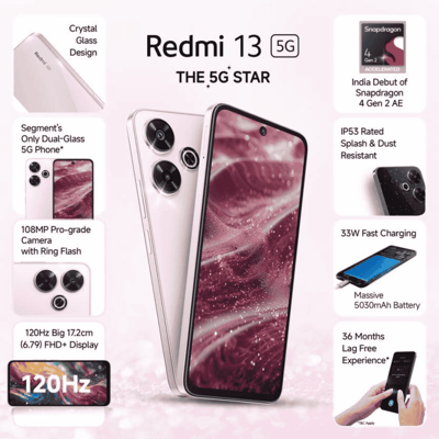 Crystal Glass Design Dynamic Ring Flash 120 Hz FHD+ Display with AdaptiveSync Refresh Rate 108 MP Pro-grade Camera with Ring Flash Snapdragon 4 Gen 2 AE Fast Charging Experience Xiaomi HyperOS